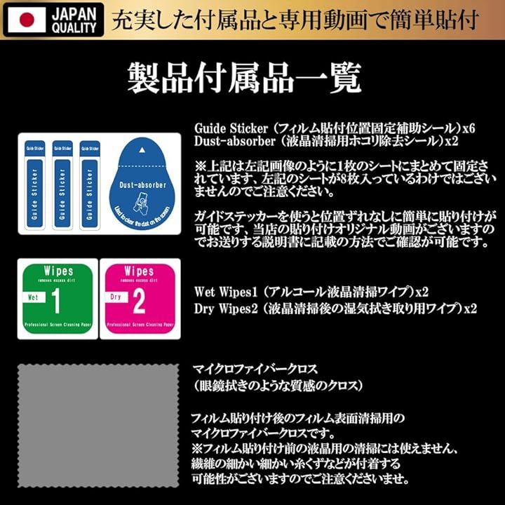 *内容品:ブルーライトカットガラスフィルムx2、ウェットクロスx2、ドライクロスx2、埃吸着シートx2、クリーニングクロスx1、パッケージ裏面貼付説明書付属。