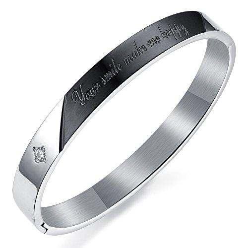 Fintier Clover Engraved "Your smile make me happy" Cz Diamond Surgical Stainless Steel Pair Bangles