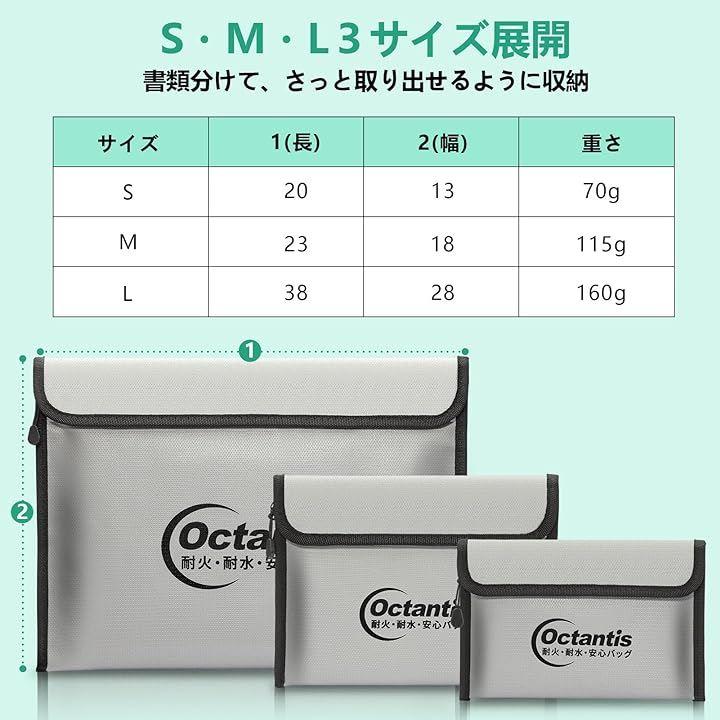 書類や小物に合わせて選べる幅3サイズ展開の耐火バッグ、Sサイズ:20x13cm / Mサイズ:23x18cm / Lサイズ:38x28cm 。