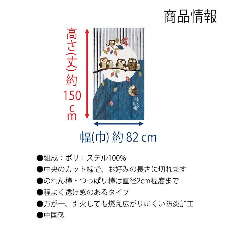 防炎のれん約82x150cm 防炎ふくろう ブルーmatu-14260■防炎加工を施したのれんです。防炎ラベルは、商品の裏側上部に縫い付けてあります。 防炎加工が施されている防炎商品は飲食店や施設などに大変喜ばれております。消防庁登録者番号と防炎タグ付き■登録確認機関名社団法人 日本繊維製品品質技術センター■防炎ラベルは、商品の裏側上部に縫い付けてあります。市販の のれん棒・突っ張り棒 (テンションポール)で簡単に取り付けできます。■サイズ・約幅82x高さ150cm ■生産地:中国■素材・ポリエステル100%■生地の目が大きいので少々透けて見えます。完全な目隠しにはなりません。【割れについて】こののれんは割れていません。お好みの長さに ハサミで 簡単にカットできるタイプです。 ( 生地の真ん中に、カットラインがあります )生活の中の目隠し、間仕切りとして使用できる 玄関や廊下、お部屋の出入り口 洗面所などに