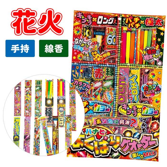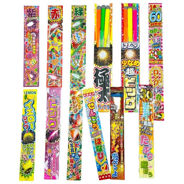 「長時間燃焼花火」「極太花火」「色変わり花火(パチパチ/キラキラ)」の4種類が入っています。