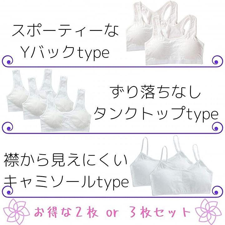 Yバック・タンクトップ・キャミソールの3タイプから選べるジュニアブラです。