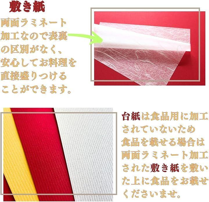 「注意点(1)」台紙となる厚紙にお食事を盛り付ける場合、台紙には食品を直接置ける加工はしておりませんので付属の懐紙や敷き紙を食品の下に敷いて台紙の上にお載せ下さい。