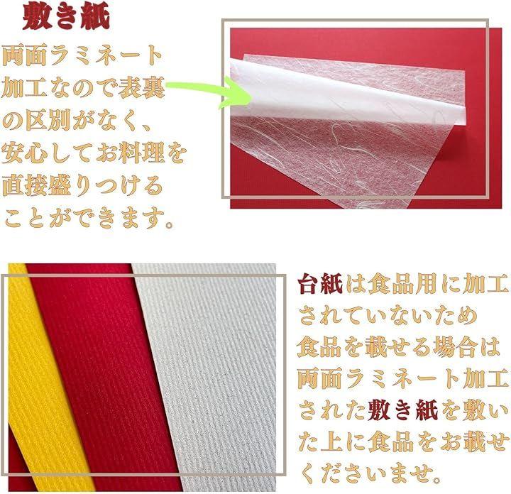 「注意点(1)」台紙となる厚紙にお食事を盛り付ける場合、台紙には食品を直接置ける加工はしておりませんので付属の懐紙や敷き紙を食品の下に敷いて台紙の上にお載せ下さい。