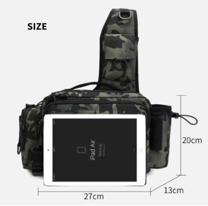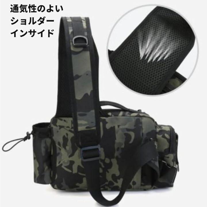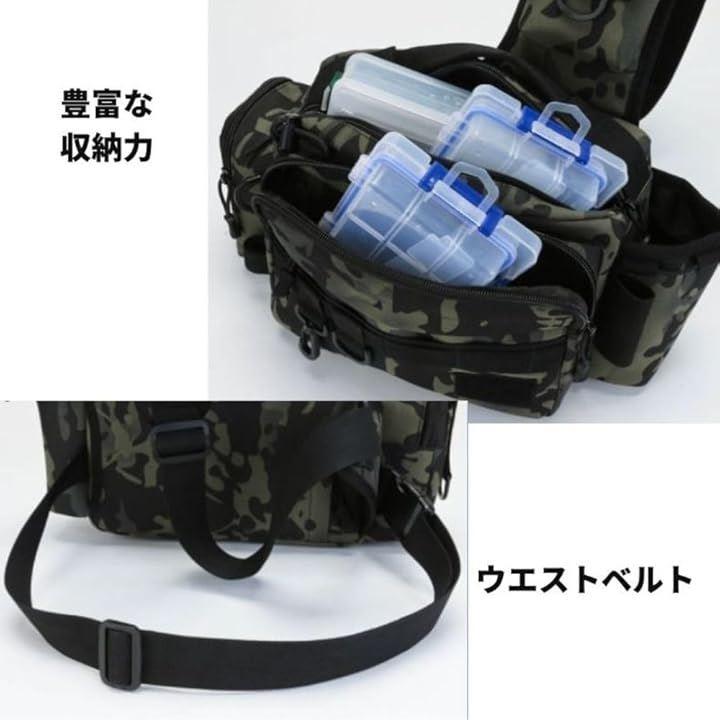 「カラー」ブラック、ネイビーカモフラージュ、グレーカモフラージュ、ブラウン 「サイズ」幅27cm x 縦13cm x 高さ20cm 重量:620g ショルダーベルト:110~140cmまで延長可能 ウエストベルトは56~110cmまで調節可能 「ポケット」・メインポケット 27x20x10cm・フロントポケットx2 25x17x4cmと25x17cm・サイドポケット5x8.5x5cm・ショルダーサイドポケット 11x8.5x2cm ・背面ポケット 22x19cm ・背面隠しポケット 14x19cm・カップポケット 直径8cm
