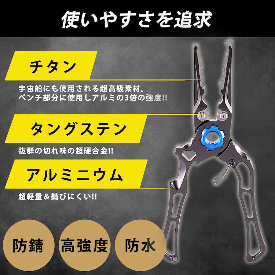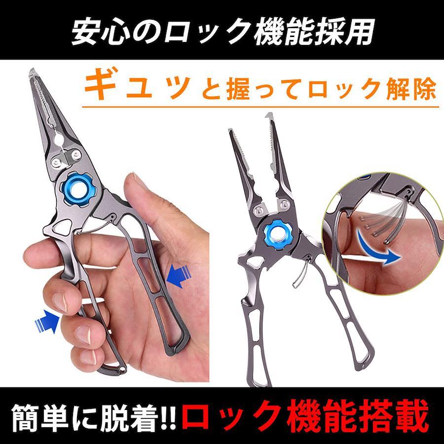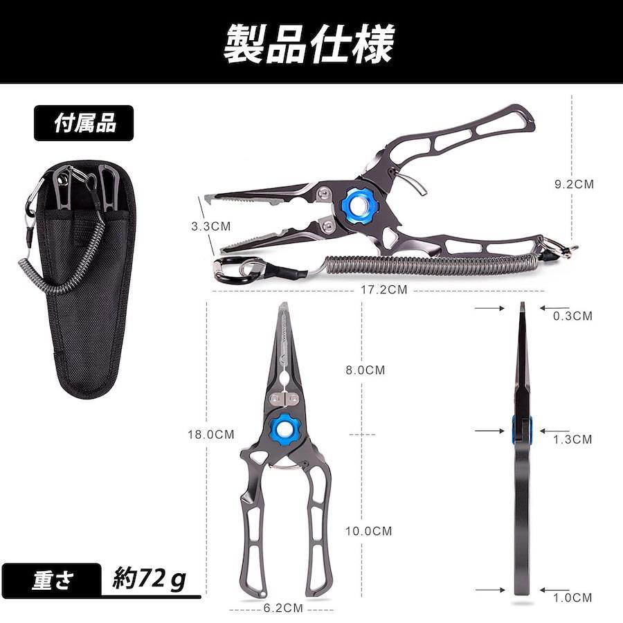 超軽量、高機能のフィッシングプライヤーです。重量は約72gとアルミボディを採用し超軽量。ランガンスタイルのお供に最適。ラインカッターは超硬合金のタングステンを採用。切れ味抜群。PEライン対応ワンタッチロック機構で大切な1本を逃さない。握るだけの簡単ロック解除。多機能フィッシングツール 軽さと強度のバランスを考慮したチタン合金を使用。 スプリットリングオープナー、ライン掴み、ガン玉潰し、ロングノーズで危険な魚の口元から守ります。色々な所に装着出来るケースと落下防止のストラップ付。フィッシングライフのお供に最適です。お客様にご満足頂ける事を第一にしております。全品検品してから出荷しておりますが、万が一製品の不具合には迅速に責任を持って対応致します。その他ご不明な点等お気軽にお問い合わせください。