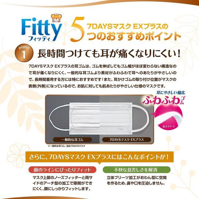 【長時間使用しても耳が痛くなりにくい】7DAYSマスクEXプラスは、ゴムを伸ばしてもゴム幅がほぼ変わらない構造であり、耳が痛くなりにくいふわふわゴムを採用しているため長時間の着用にもおすすめです。顔のラインにぴったりフィットし、立体プリーツ加工で不快な息苦しさを解消。耳かけゴムの位置が表側になっているため、肌あたりがやさしい仕様のマスクです。