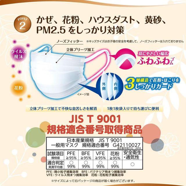 【3層構造でしっかりガード】3層構造の不織布を使用しており、かぜ・花粉・黄砂・ハウスダスト・PM2.5をしっかり対策。フィルタ捕集効率試験で、細菌やウイルスを含む飛まつ99%カット、花粉や微粒子99%カット(BFE試験/VFE試験/PFE試験)。