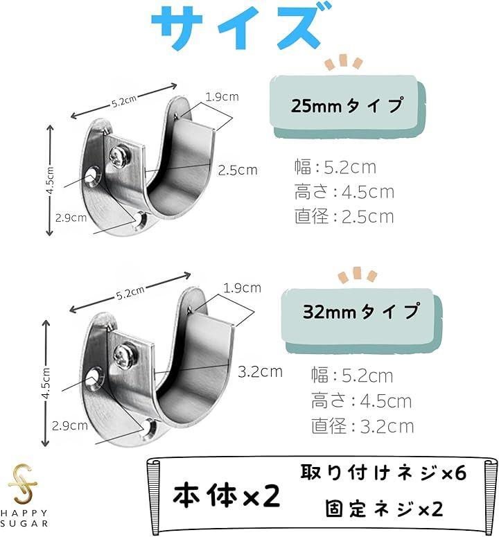 「商品詳細」本体2個、取付ネジ6本、固定ネジ2本、サイズ:横5.2cm,縦4.5cm,対応パイプサイズ;直径2.5cm サイズ:横5.2cm,縦4.5cm,対応パイプサイズ;直径3.2cm