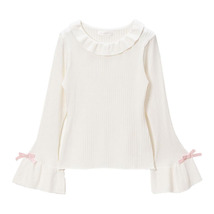 フレアスリーブとフリル襟が【デザイン】手元を動かすたびに揺れるフレアスリーブはどこか上品な印象にしてくれ、思わず目を惹かれるデザインです。手首に付いた配色リボンやお顔周りを華やかに彩るフリル襟など、甘めなディティールが可愛いポイント◎首回りは程よく開いており、被りで簡単に着用いただけます。リブ部分は綺麗に体にフィットしてくれて、スタイルもすっきり見えるように!ホワイト×ブラックとブラックは襟先と袖口が配色になっており、ピンクはシンプルな単色ホワイトなので、お好みのデザインをお選びください♪