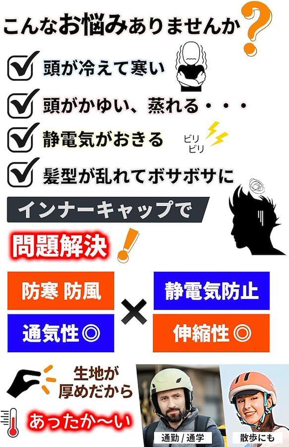 ヘルメットのインナーキャップとして、アウトワーク (工事現場や警備員など外でのお仕事)、スキーやスノーボード、自転車 通勤通学、登山や釣り、ジョギング等に最適です *フルフェイスのインナーキャップとしてもご使用可能ですが、防寒重視の商品の為少しきつめになってしまう場合もございます。