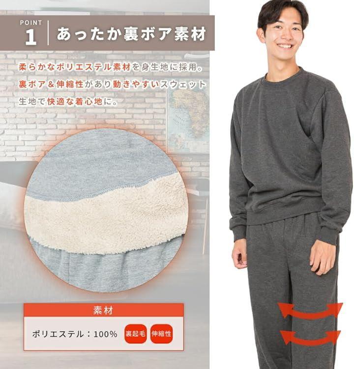 「寒い季節のルームウェアやパジャマに」 このスウェットセットアップは、裏ボア素材を採用しており、寒い季節にぴったりのルームウェアやパジャマとして活躍。