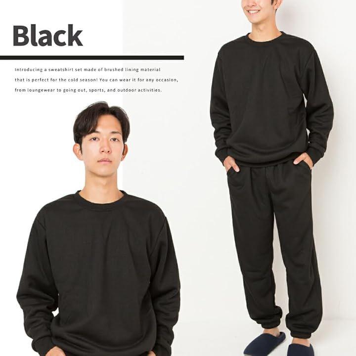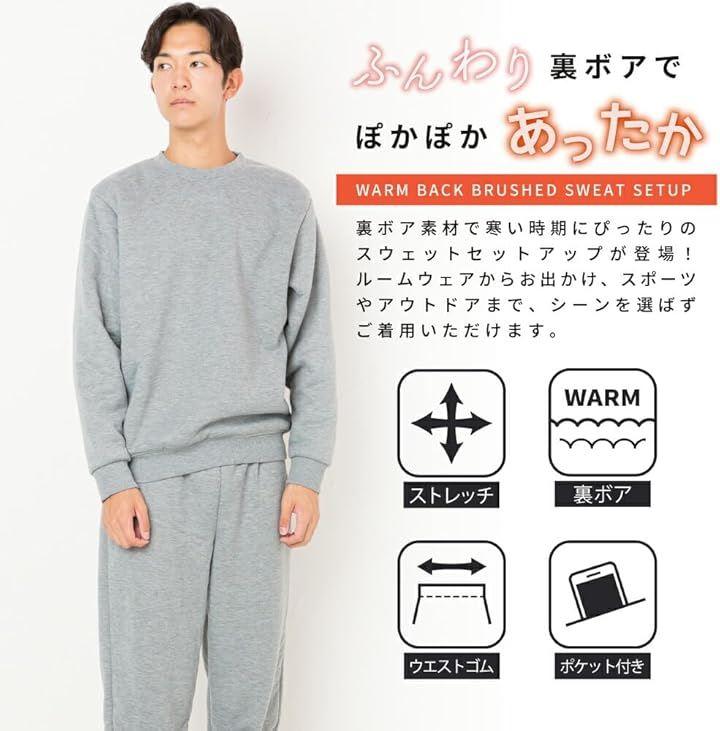寒い季節に裏ボア素材を使用した、暖かくて動きやすいトレーナーとパンツの上下セット。