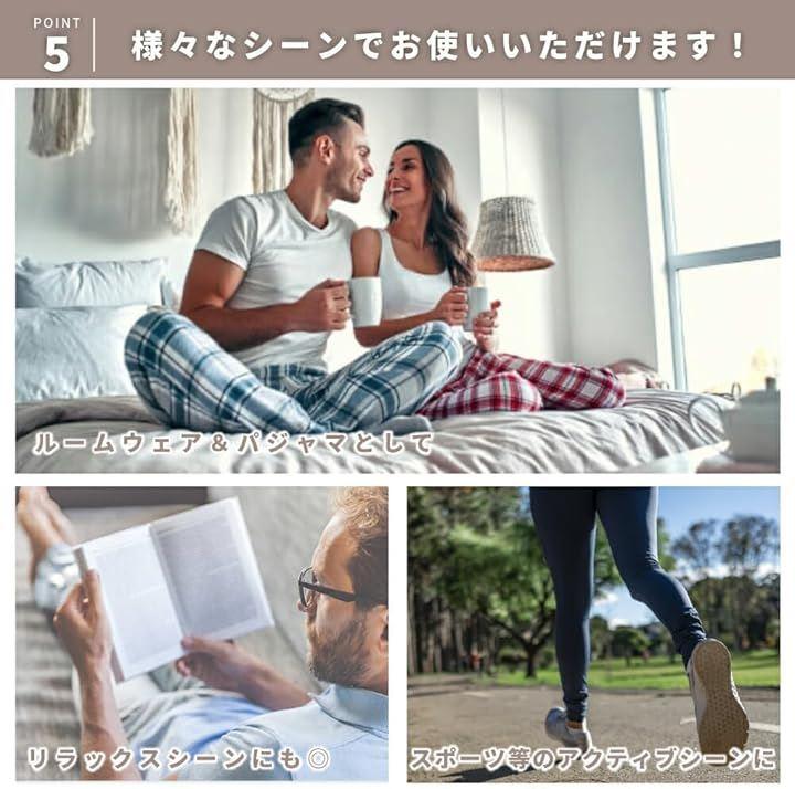 「デイリーユース:日常生活の様々なシーンに対応」 ルームウェアやパジャマとしてはもちろん、スポーツやアウトドアまで、幅広いシーンで快適に着用できるセットアップ。