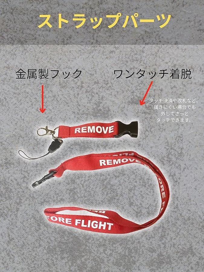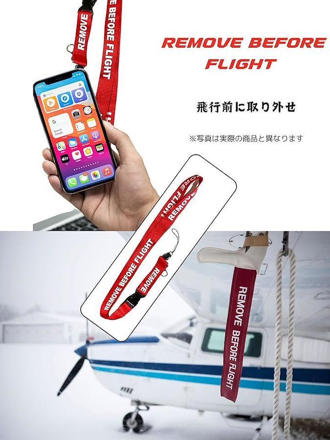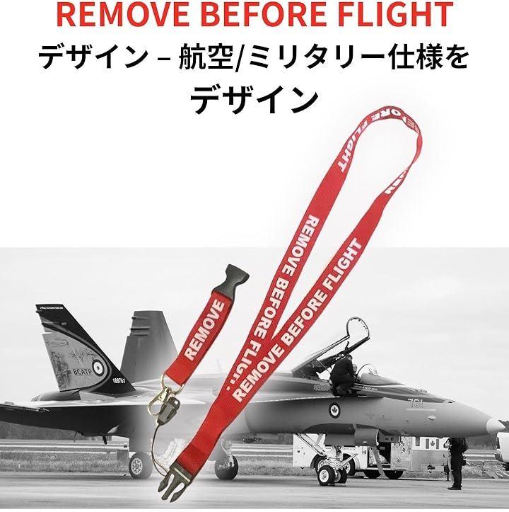 「REMOVE BEFORE FLIGHTデザイン – 航空ミリタリー仕様をイメージしてデザイン」本製品は、航空機整備の現場で実際に使用されている「REMOVE BEFORE FLIGHT(飛行前に取り外せ)」タグをモチーフにしたネックストラップです。