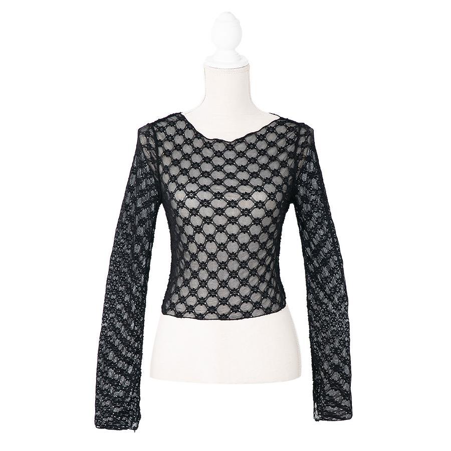 一枚でもレイヤードでも活躍する、バレエコアライクなレーストップスのご紹介。【デザイン】シンプルながら程よい透け感が女性らしく、軽やかさを演出してくれるレーストップス。襟元が横に広めで、伸縮性も抜群なので被りでも簡単に着用できる仕様です。ネックと袖口部分のメロウデザインがさりげなくアクセントに。首筋を綺麗に見せる襟元とピタっとしたシルエットがバレエコアな着こなしを叶えます。インしてもしなくてもバランス良く着れる着丈になっているので、お好みでスタイリングして下さい◎