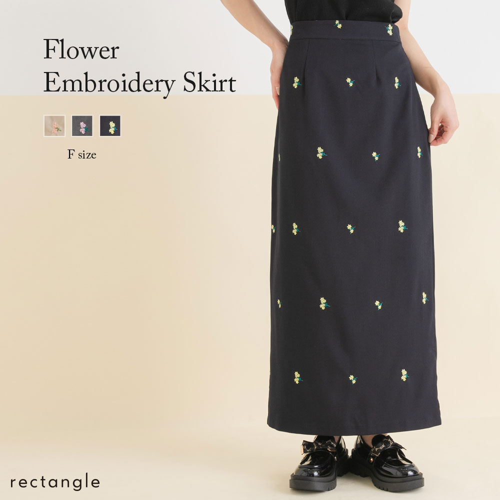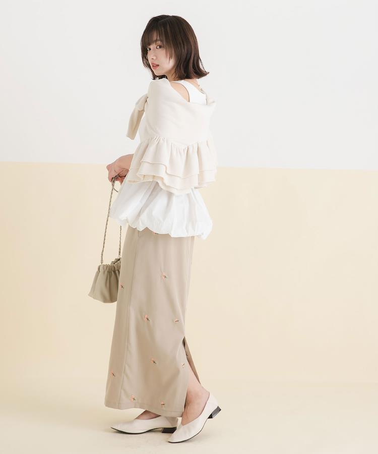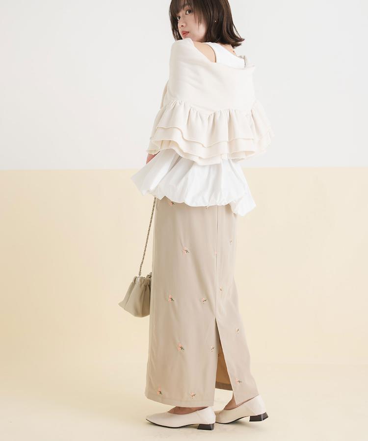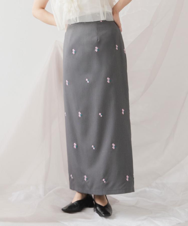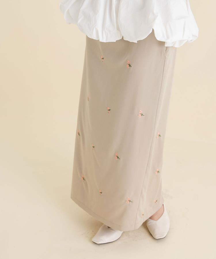 スカート全体に施された、控えめで上品な花柄刺繍が女性らしい1着。