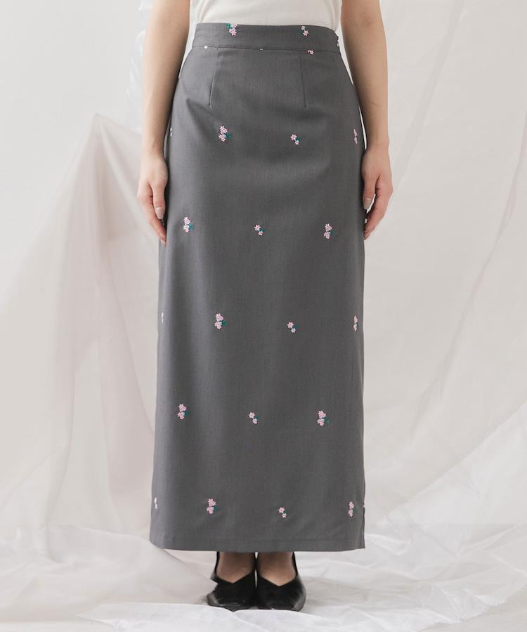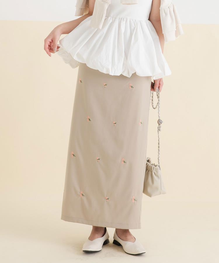 スカート全体に施された、控えめで上品な花柄刺繍が女性らしい1着。