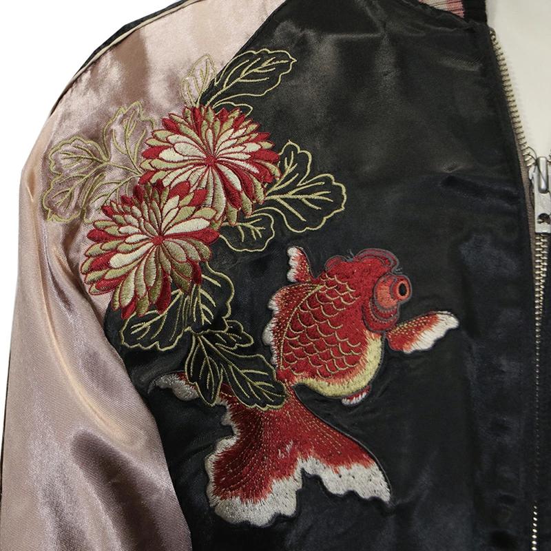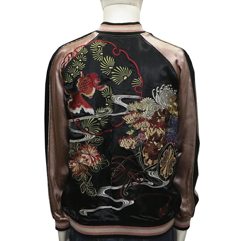 華やかなと鮮やかな袖のピンクがマッチして雅ながら優しい雰囲気のスカジャンです。