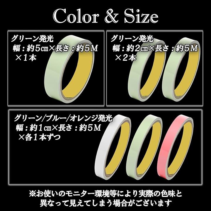 「バリエーション」幅5cmx5M、幅2cmx5M(2個セット)、幅1cmx5M(3色セット)の3つをご用意しているので、使用用途に合わせてお選びください。
