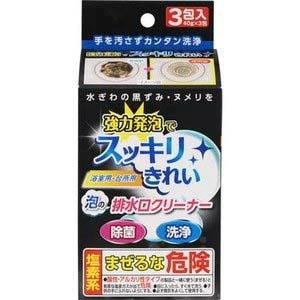 商品説明浴室用・台所用●入れるだけ、流すだけで手を汚さずカンタン洗浄。●お風呂やキッチンの排水口をまるごと強力発泡でスッキリきれい!!●洗浄効果だけでなく除菌効果※もあります。※全ての菌を除菌するわけではありません。表示成分<成分>ジクロロイソシアヌル酸塩、発泡剤(炭酸塩、有機酸)、界面活性剤(アルファオレフィンスルホン酸ナトリウム)<液性>中性~弱酸性用法・用量/使用方法<用途>浴室・台所の排水口<使用量の目安>浴室の排水口:2000立方センチメートル(幅20cm×奥行20cm×高さ5cm程度)につき1包台所の排水口:3000立方センチメートル(直径15cm×高さ16cm程度)につき1包<使えるもの>ステンレス製品・プラスチック製品<使えないもの>銅・鉄・真ちゅう・ホーロー・アルミニウム等の金属製品、ゴミ取りネット、ディスポーザー(生ゴミ処理機)、浴槽内の排水口<使用方法>●使用中は泡に触ったり、子供や認知症の方が近づかないよう注意してください。ご使用前に、排水口にフタがついている場合ははずし、ヌメリ取り剤等の他の製剤とは併用しないでください。[浴室で使用する場合]目皿のゴミや髪の毛を取り除いた後に使用してください。1.目皿の上面の全体を覆うように1包をまんべんなく投入する。2.粉全体にかかるようゆっくりと水をコップ1杯(約200mL)かける。3.30分以上放置する(長時間放置しないでください)。※排水口にフタがある場合は、フタを閉めてください。4.洗浄終了後、泡がなくなるまで十分に水を流す。[台所で使用する場合]ゴミ受けカゴのゴミとネットを取り除いた後に使用してください。1.ゴミ受けカゴの底全体を覆うように1包をまんべんなく投入する。2.粉全体にかかるようゆっくりと水をコップ1杯(約200mL)かける。3.30分以上放置する(24時間以上放置しないでください)。4.洗浄終了後、泡がなくなるまで十分に水を流す。※本品を投入する際は粉が舞う場合があるため、ゆっくりと入れてください。※本品に対し、ぬるま湯(40℃)をかけるとより効果的です。※冬期に使用すると泡立ちが悪くなる場合があります。※勢いよく注ぐと泡立ちません。※汚れがひどい場合は、数回続けてご使用ください。※黒ずみの程度によっては、落ちない場合があります。使用場所付近に本品のパッケージを置くなど、使用中であることがご使用者以外の方にもよくわかるようにしてご使用ください。広告文責:株式会社アカカベ電話:072-878-1339