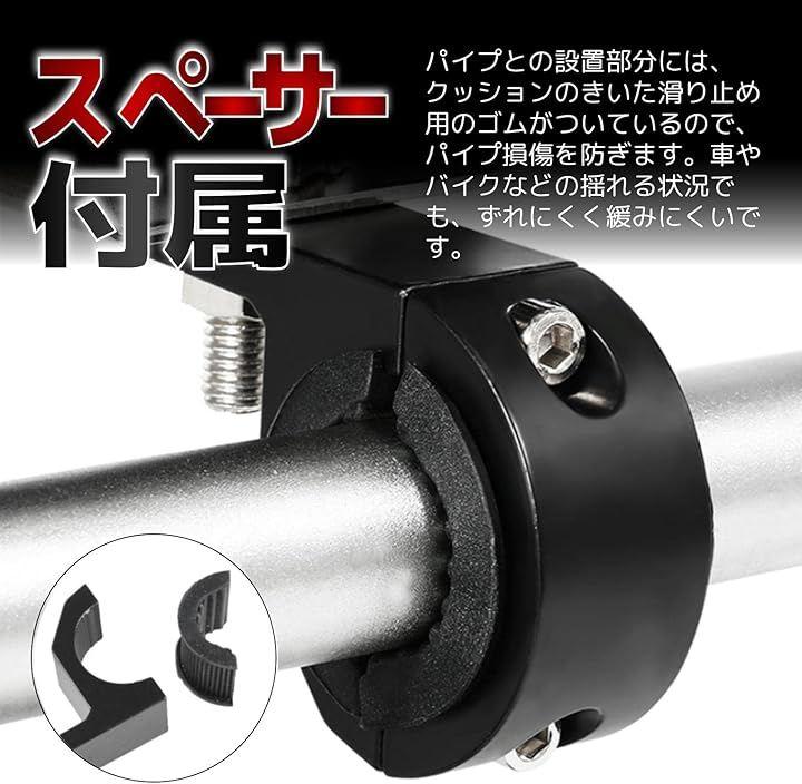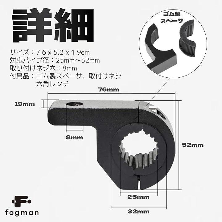 「詳細」サイズ:7.6 x 5.2 x 1.9cm/対応パイプ径:25mm~32mm/取り付けネジ穴:8mm/付属品:ゴム製スペーサ、取付けネジ、六角レンチ/材質:アルミ合金製