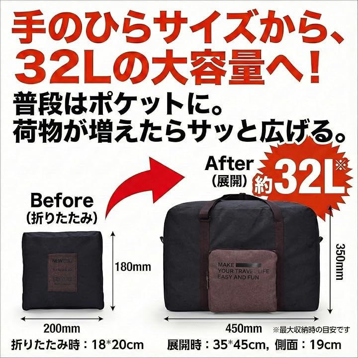 Foldable Boston Bag, 340g, Approx. 32L, Carry-on Bag, Lightweight, Large Capacity, Water-repellent