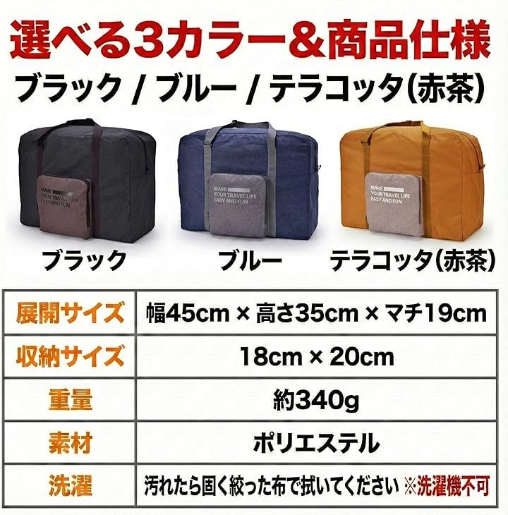 「350ml缶ジュース1本分(約340g)の軽さで、2泊3日の荷物を収納」 バッグ自体の重さは約340g。