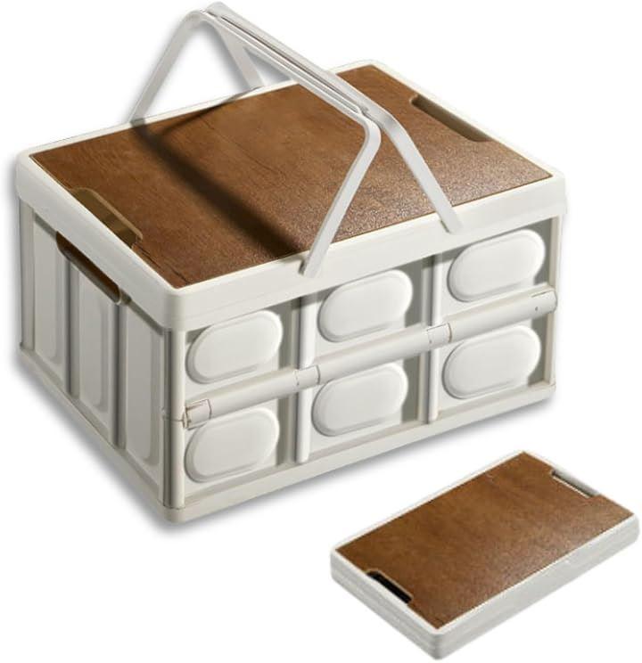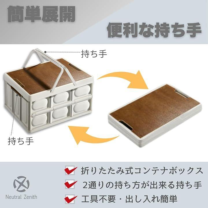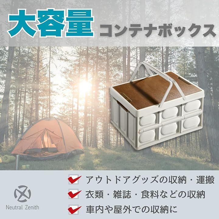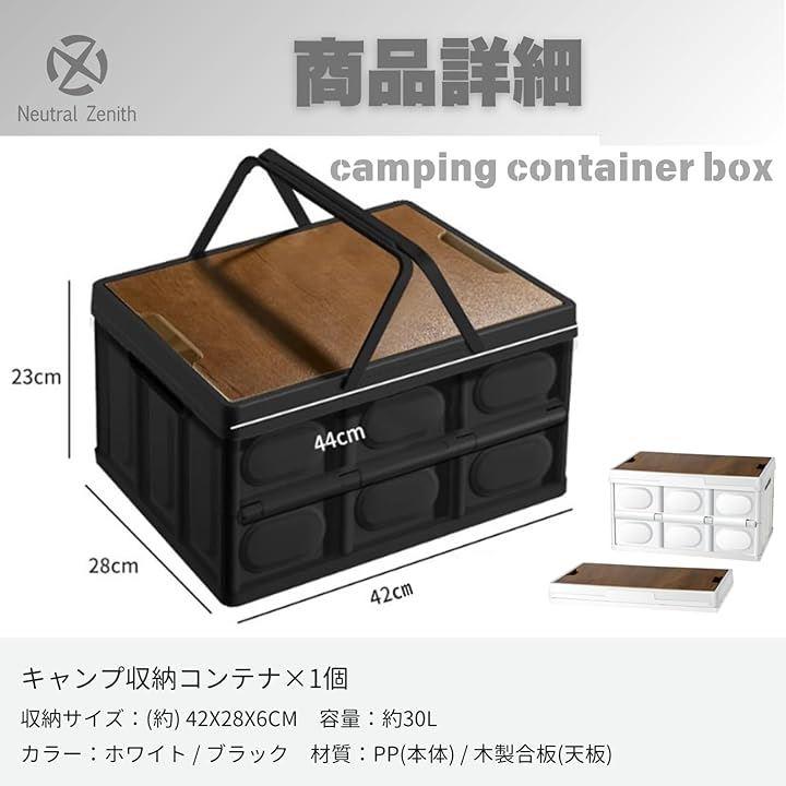 「商品詳細」キャンプ収納コンテナx1個 使用サイズ:(約) 42x28x23cm 収納サイズ:(約) 42x28x6cm 容量:約30L カラー:ホワイト / ブラック 材質:PP(本体) / 木製合板(フタ)