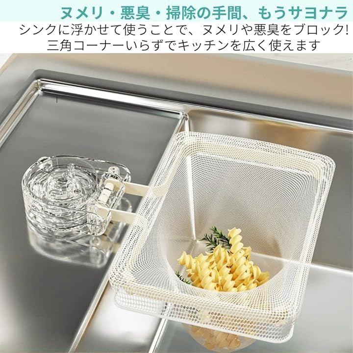 シンクに浮かせて設置するのでヌメリや悪臭、掃除の手間も激減。三角コーナーが不要になり、キッチンを広く使えます。