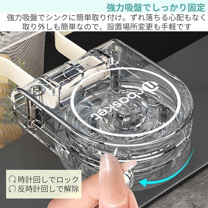 「強力吸盤でしっかり固定」吸盤式でシンクに簡単取り付け。