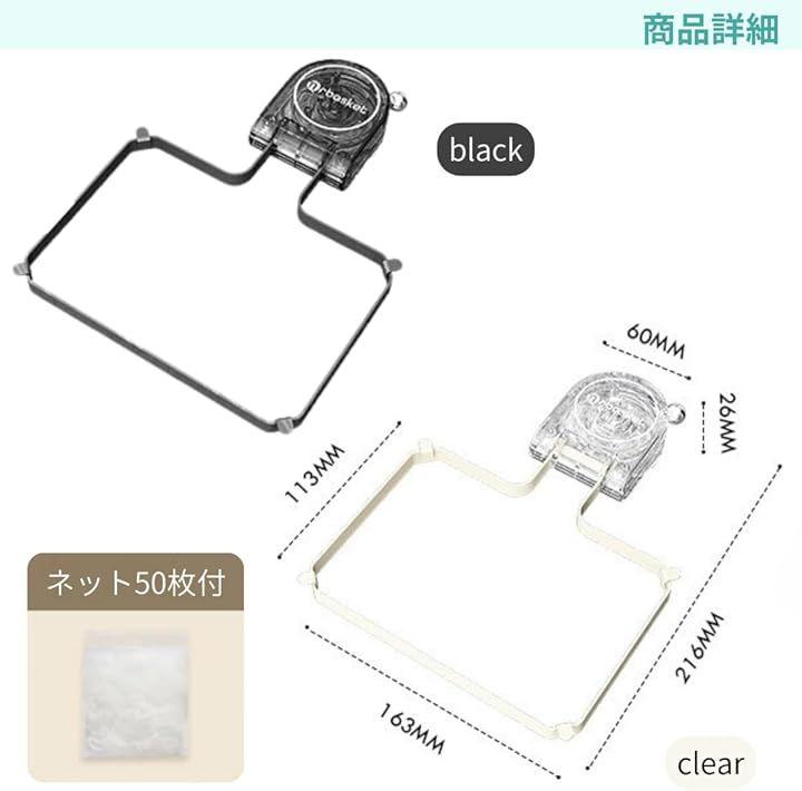 「商品詳細」セット内容:ネットホルダー本体1個、ネット50枚 サイズ:16.3 x 21.6 x 2.6(cm) カラー:クリア / ブラック