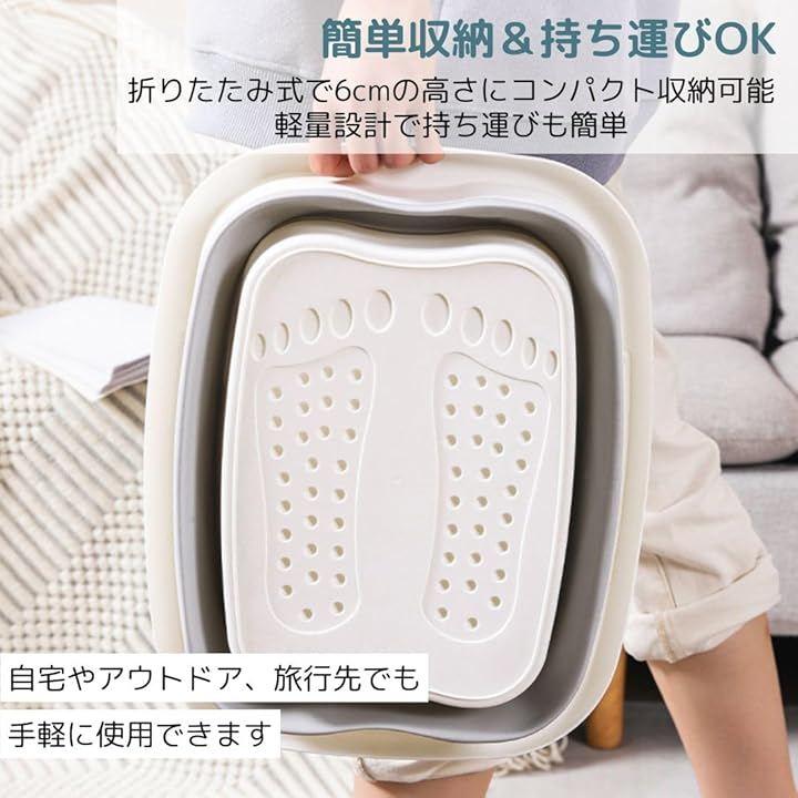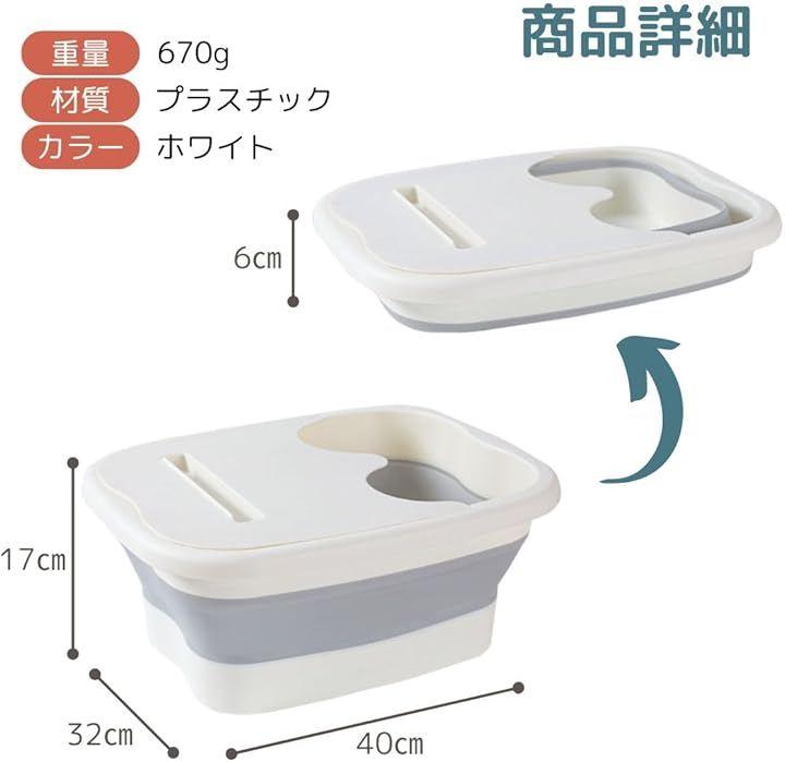 「商品詳細」サイズ(約):40x32x17cm(折り畳み時:高さ6cm) 足が入る部分(約):28cmx21cm 重量:670g 材質:プラスチック カラー:ホワイト