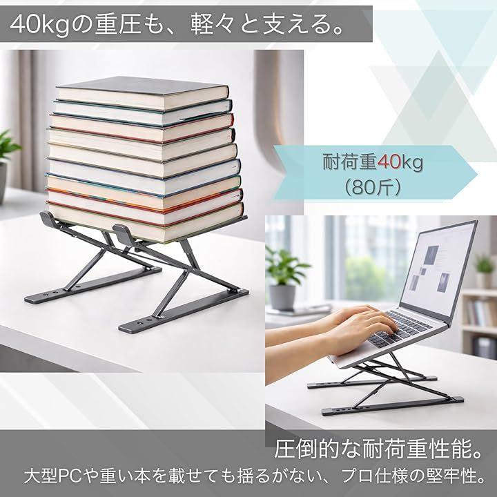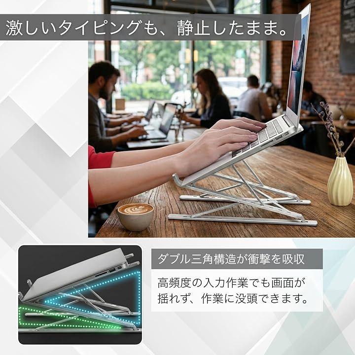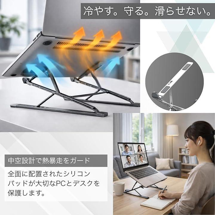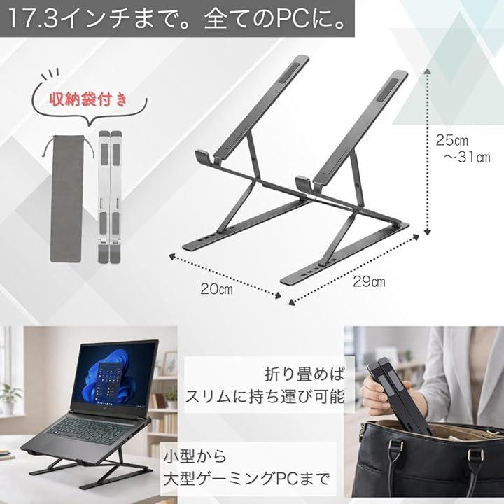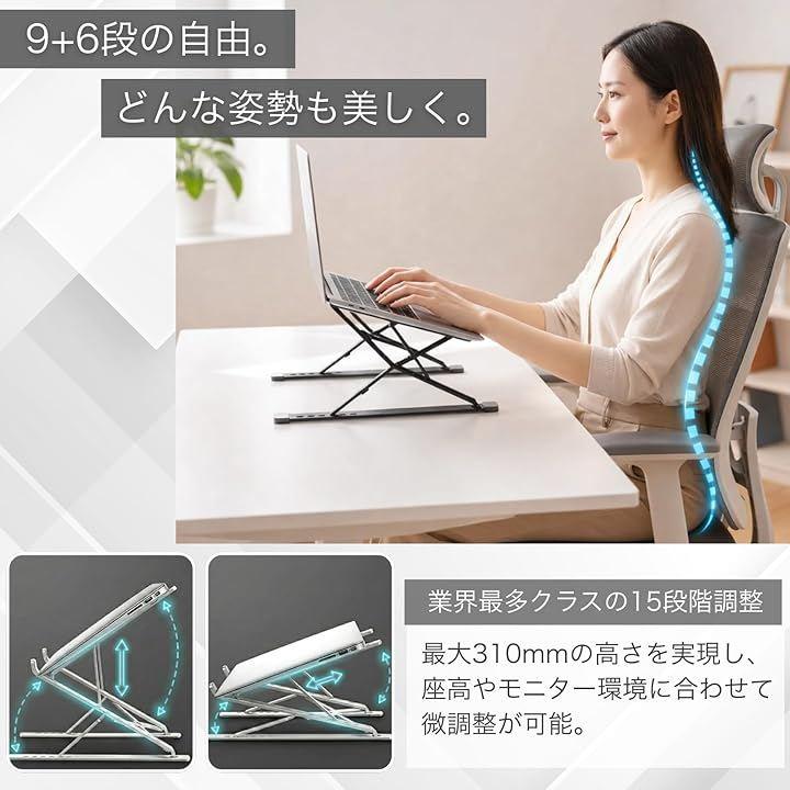 *製品詳細 ・カラー:シルバー / グレー ・素材:プレミアムアルミ合金、高密度シリコンパッド ・調整:15段階(9段階高さx6段階角度) ・対応:11~17.3インチのノートPC・タブレット