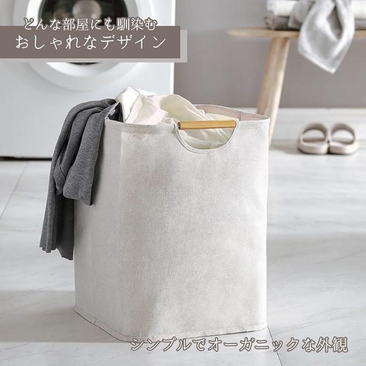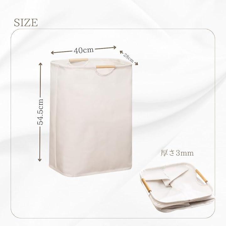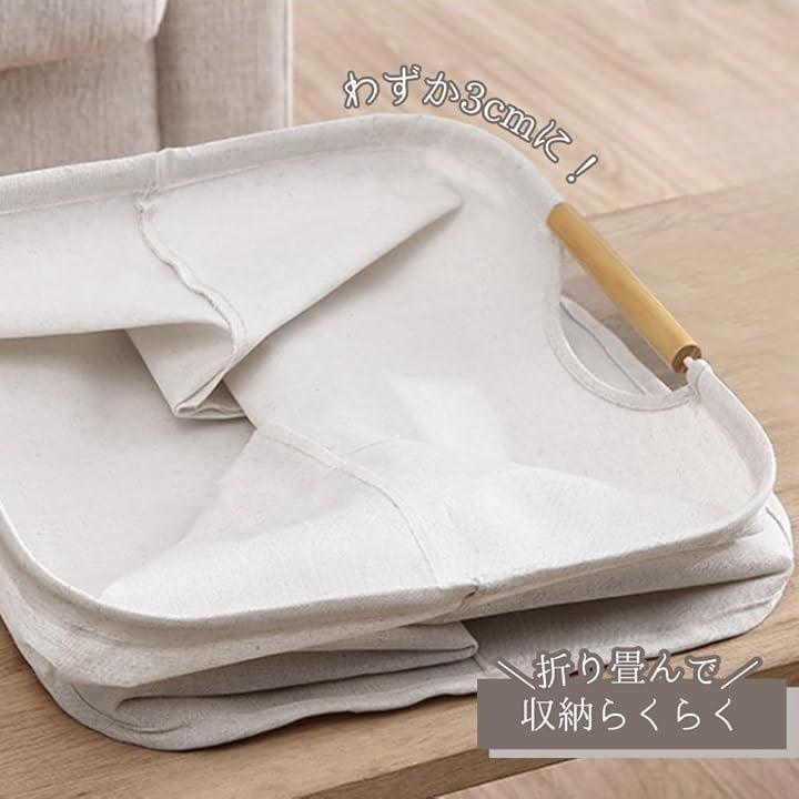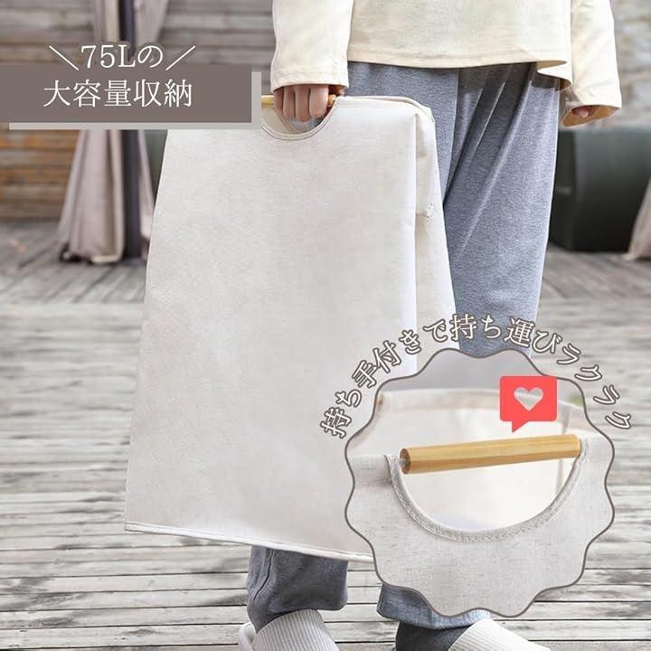 「商品内容」本体サイズ(展開時):全長54.5cm、幅40cm、奥行28cm、厚さ約3cm(折りたたみ時) 容量:75L 主な材質:綿・麻(本体)、木(ハンドル)