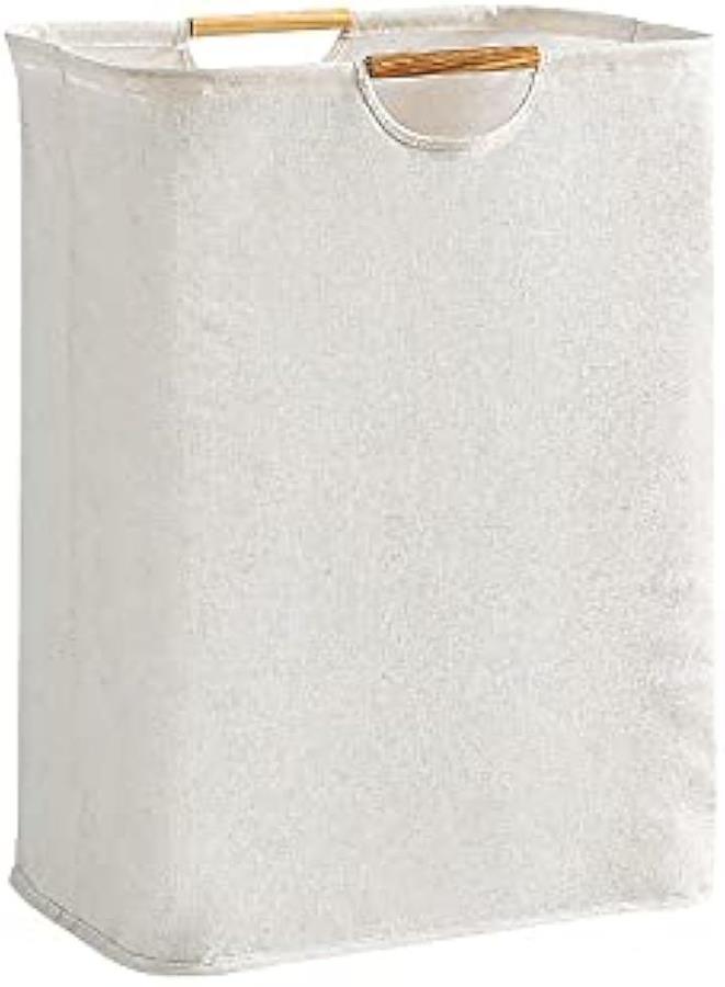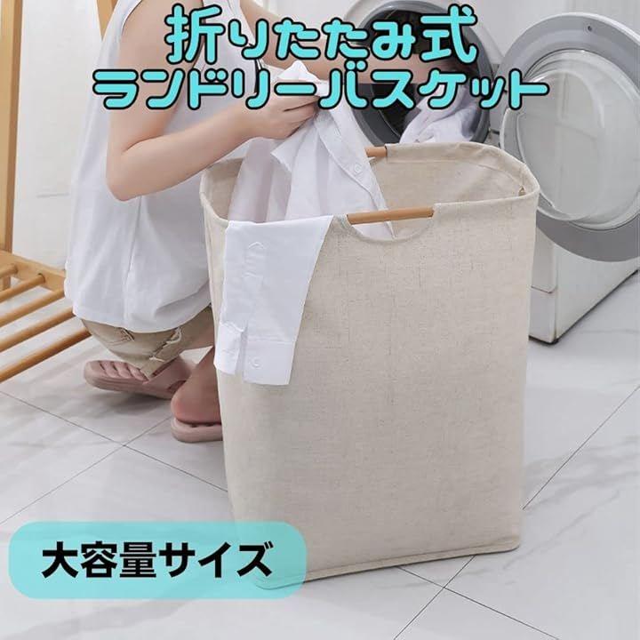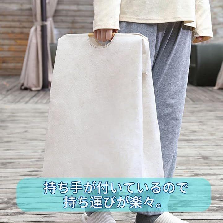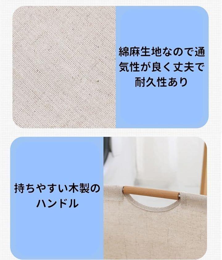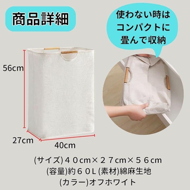 「商品詳細」(サイズ)40cmx27cmx56cm (容量)約60L (素材)綿麻生地 (カラー)オフホワイト (持ち手部分)持ち手のウッド部分は木材を使用しているため性質上、色合いが異なる場合がございます。