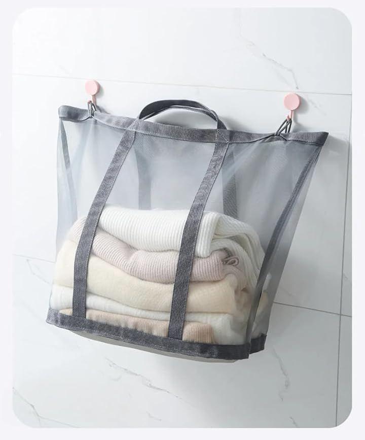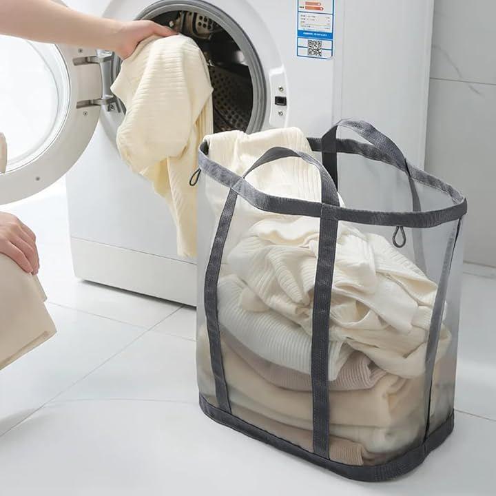 「折りたたみ可能」コンパクトに折りたためる便利なメッシュ素材のランドリーバッグ。