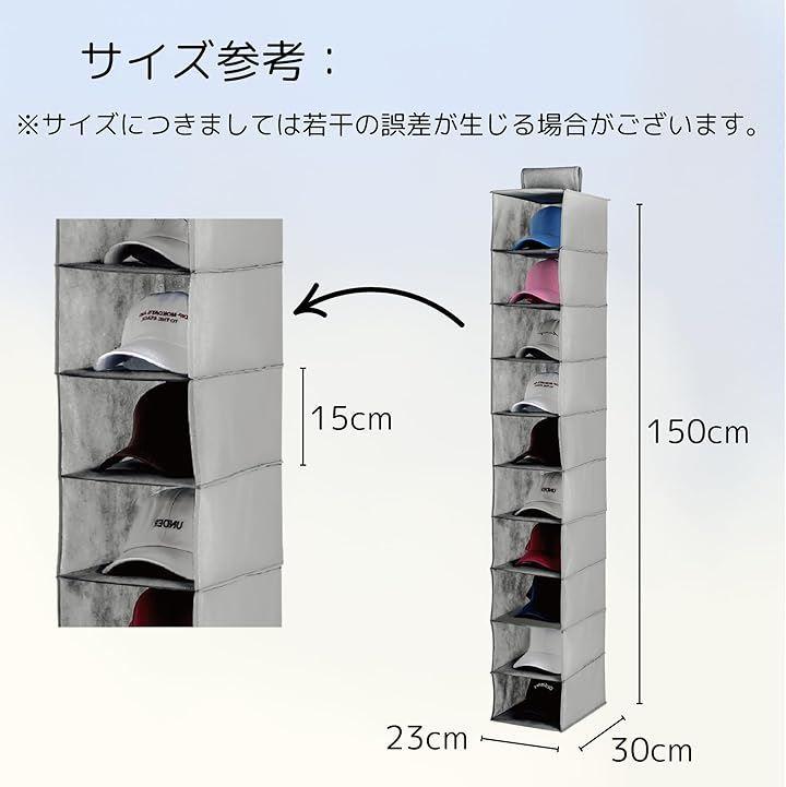 10段の収納スペースを持ち、幅23cm、奥行30cm、高さ150cmのコンパクトなサイズで、クローゼットや部屋の隅に簡単に設置できます。