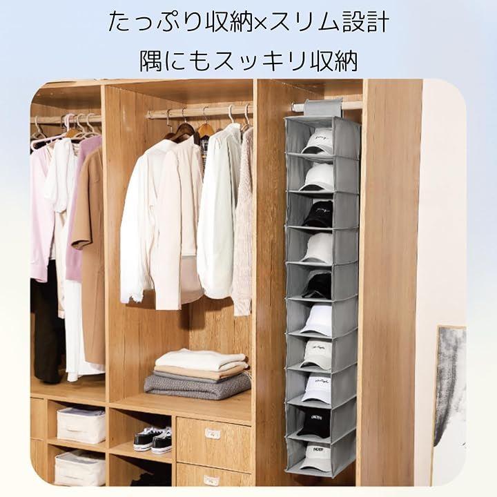 「大容量」10段の収納スペースを備えたこのキャップラックは、多くの帽子を一度に収納可能です。