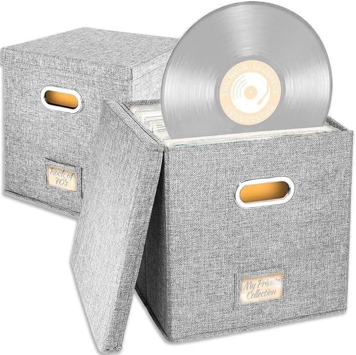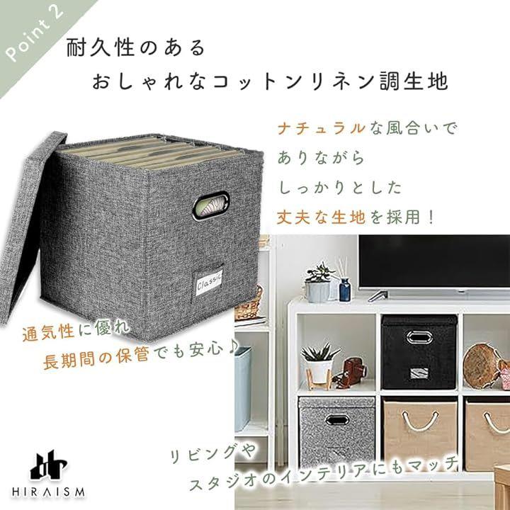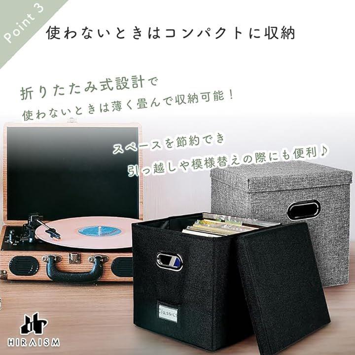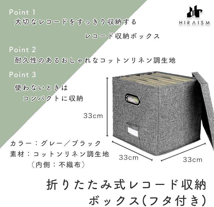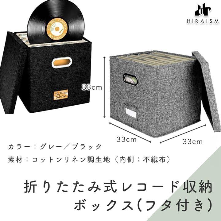 「商品詳細」 折りたたみ式レコード収納ボックス(フタ付き) カラー:グレー/ブラック サイズ:縦33cm 横33cm 高さ33cm 素材:コットンリネン調生地(内側:不織布)