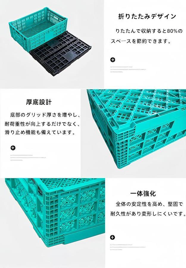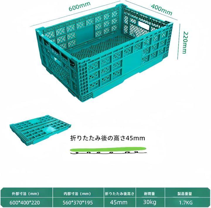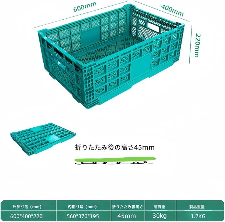 「商品仕様」サイズ:約幅60cm奥行40cm高さ22cm(収納時4.5cm) 材質:ポリプロピレン 耐荷重:(約)30kg 容量:42L 積み重ね重量:70kg
