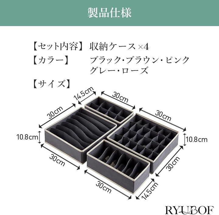 「4セットで多目的に使える収納力」6仕切り下着収納、7仕切りブラ収納、24仕切り靴下収納、8仕切りスカーフ収納の4個セットで、引き出しやクローゼットを自分好みにアレンジして賢く整理できます。