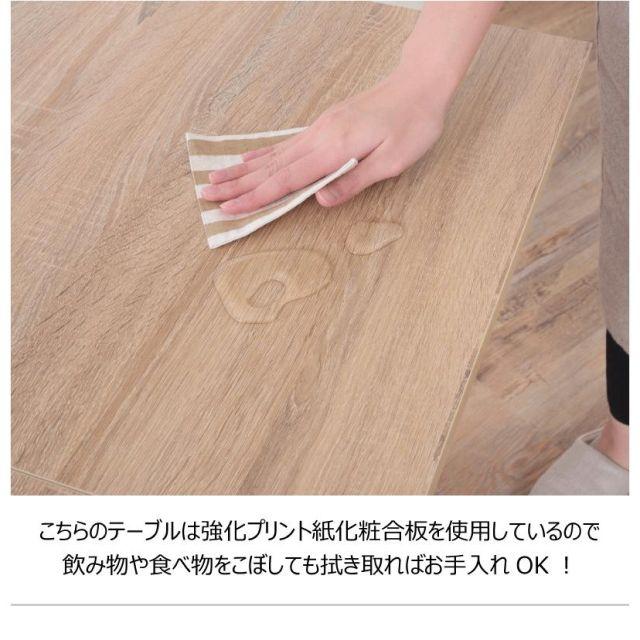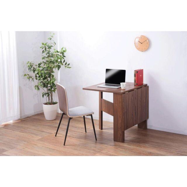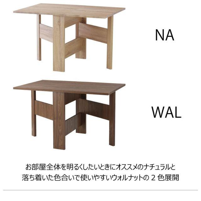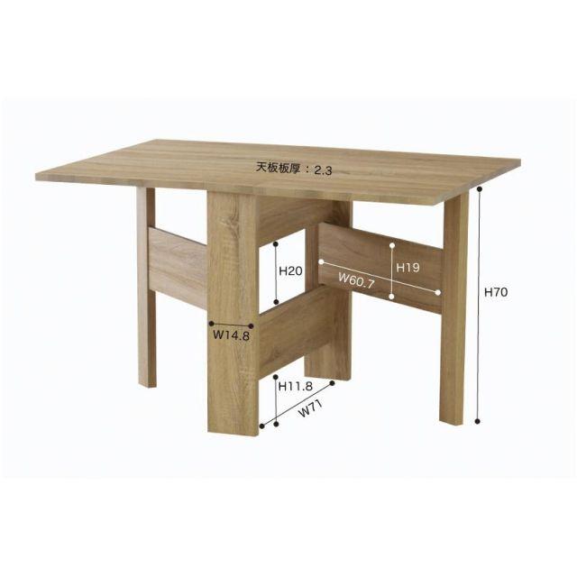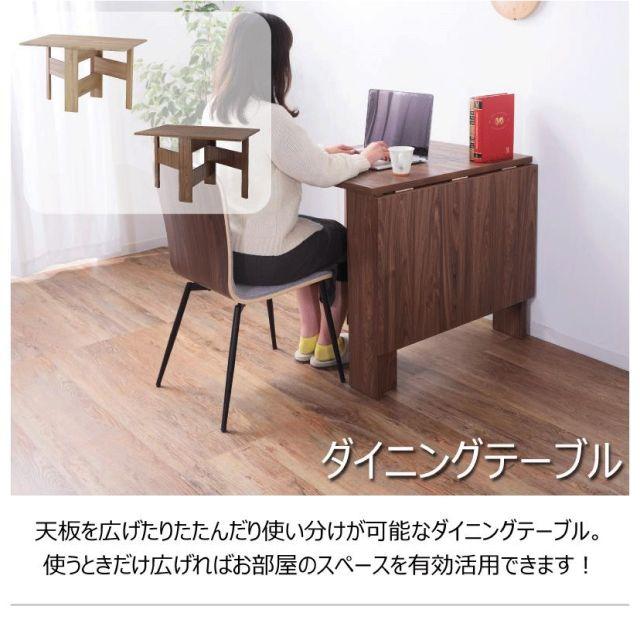 フォールディングダイニングテーブル2カラーナチュラルウォルナット●天板を広げたり折りたたんだり、使い分けが可能なダイニングテーブル。●片開き時は2人用テーブルやデスクとして。両開き時は4人用テーブルして使えます。●天板は折りたたんで収納可能。幅約20.5cmととってもコンパクト。●天板を広げたときはは両サイドにあるロックで簡単に固定。使用中に天板が閉じたりガタつく心配もありません。●テーブル本体には木目調の強化プリント紙化粧合板を使用。天然木・無垢材では難しい「統一感」を実現。●強化プリント紙化粧合板は汚れに強くお手入れが簡単なのでいつでも清潔。●弾力のある床キズ防止クッションが脚裏全体に張られているのでフローリングの使用でも安心。●お部屋全体を明るくしたいときにオススメのナチュラルと落ち着いた色合いで使いやすいウォルナットの2色。ナチュラルウォルナット〈製品規格〉【商品サイズ】