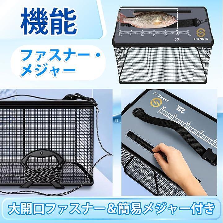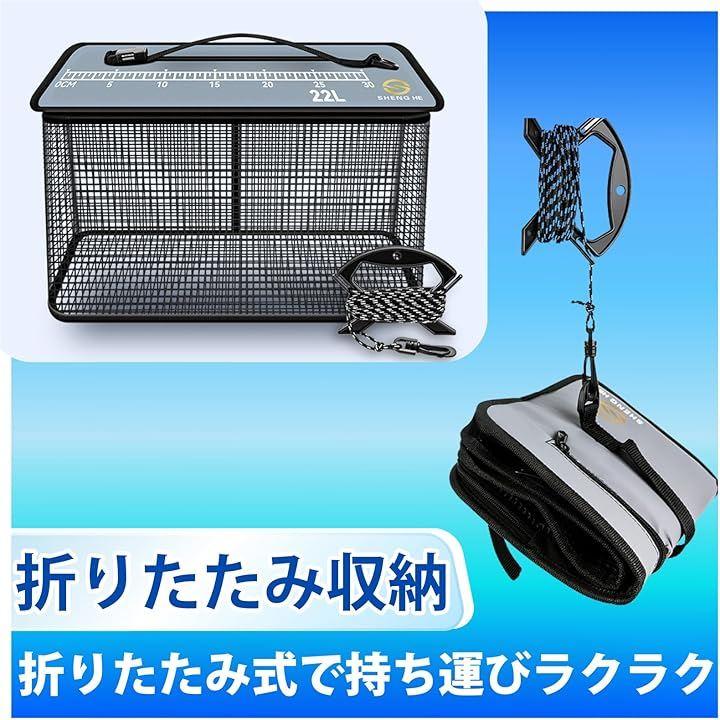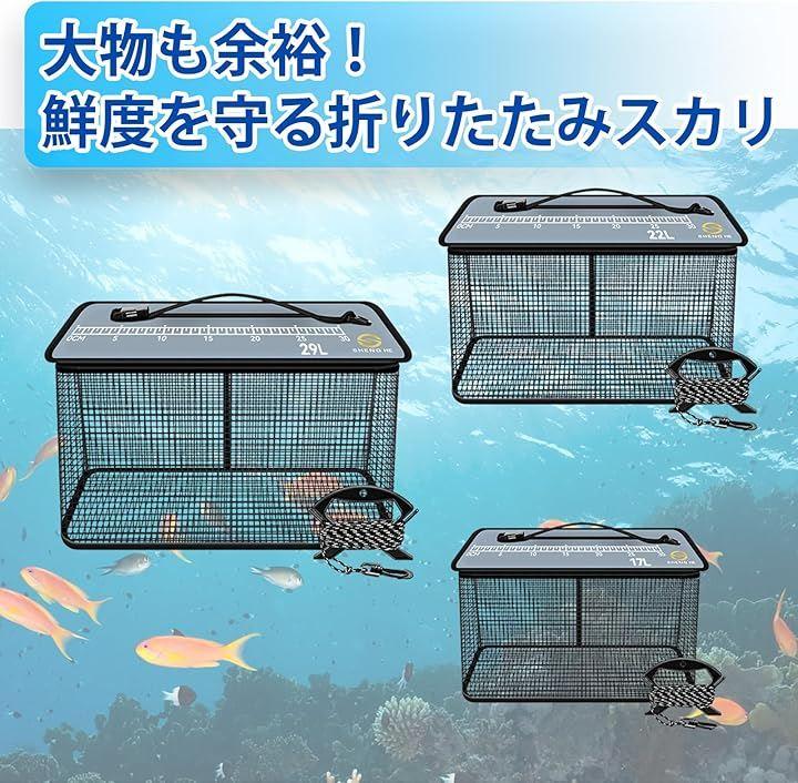・サイズ:17L / 22L / 29L ・仕様:折りたたみ式、フローティングタイプ ・付属品:専用ロープ(5m) ・梱包状態:折りたたみでお届け(取扱説明書なし) 大物釣りも安心。鮮度を守りながらコンパクトに持ち運べる万能スカリ。