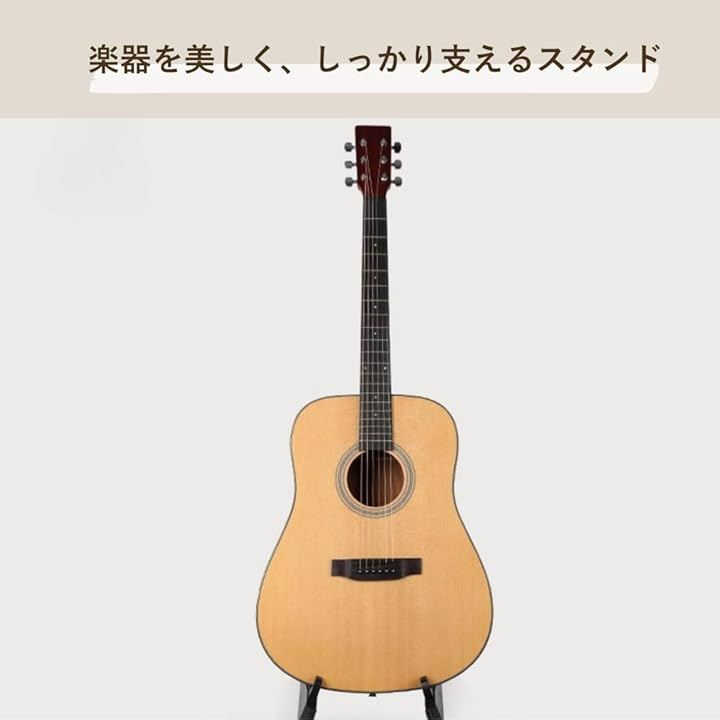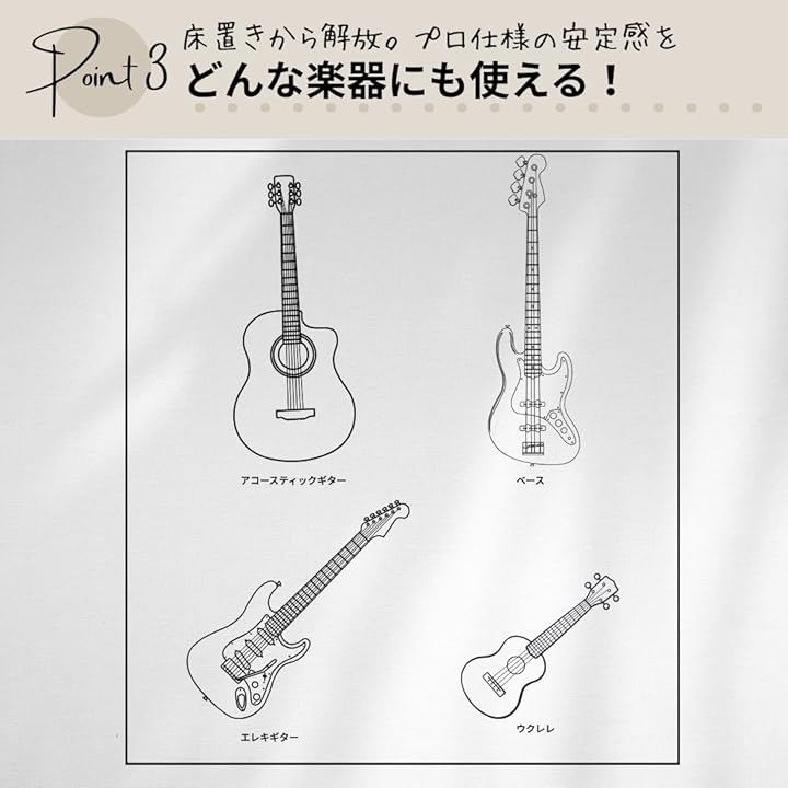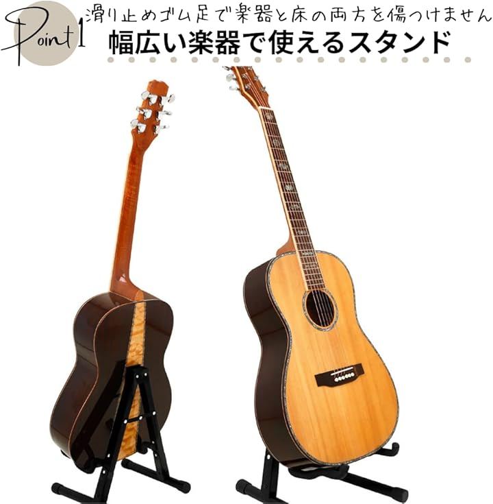 コンパクトなギタースタンド」アコースティックからエレキ、ベース、ウクレレまで、幅広い楽器をしっかり保護。