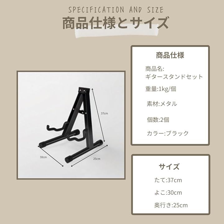 「商品仕様」商品名:ギタースタンドセット 重量:1kg/個 素材:メタル 個数:2個 サイズ:37cmx30cmx25cm カラー:ブラック