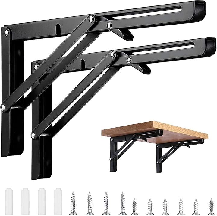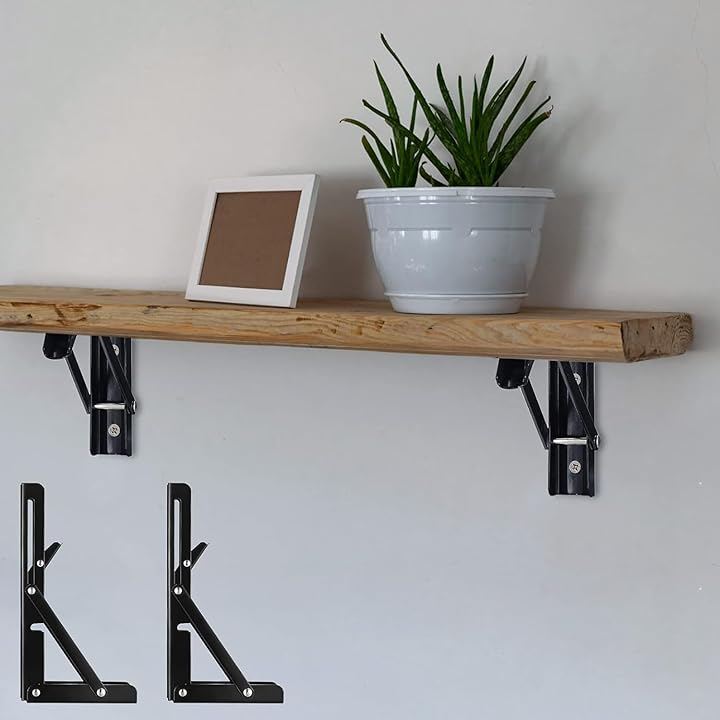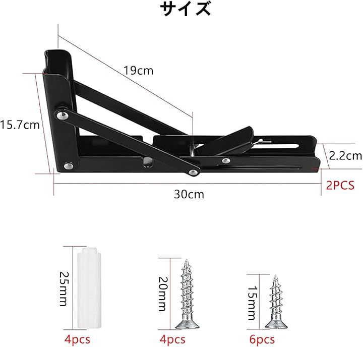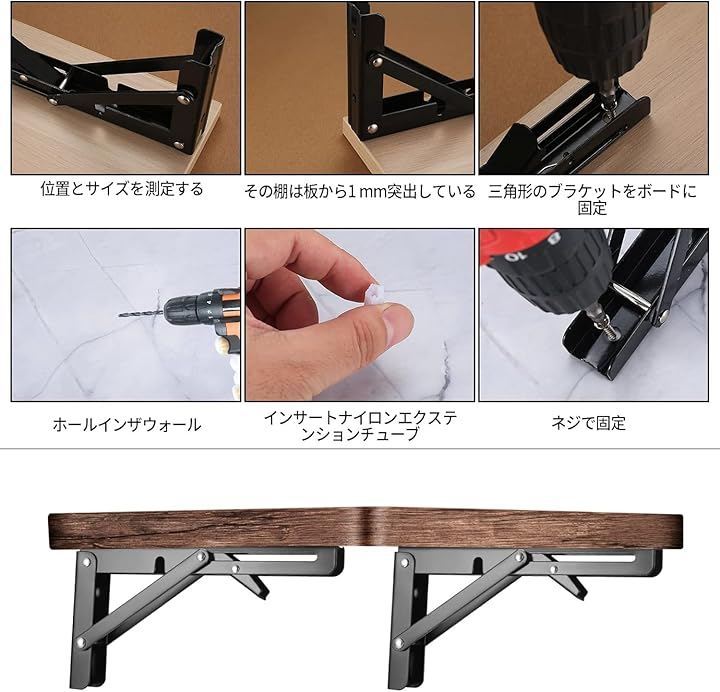 「便利な折り畳み棚受け金具」: 邪魔になる場合にはワンタッチで簡単に折り畳むことができる折りたたみ式ブラケットです。