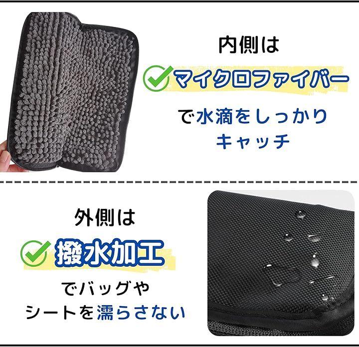 吸水性能:内側はマイクロファイバーで水滴をしっかりキャッチ 外側は撥水加工でバッグやシートを濡らさない