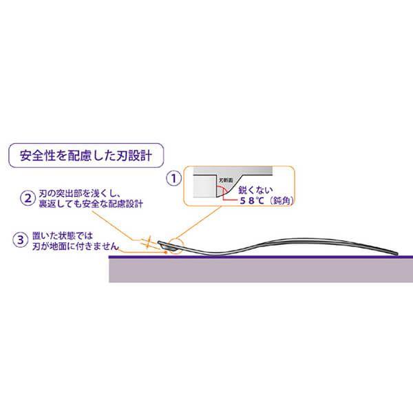 ◆刃断面角約58゜の垂直刃により安全性を高めつつ切れ味を保持。引っ掻き方式で食い込みによるケガを防止。