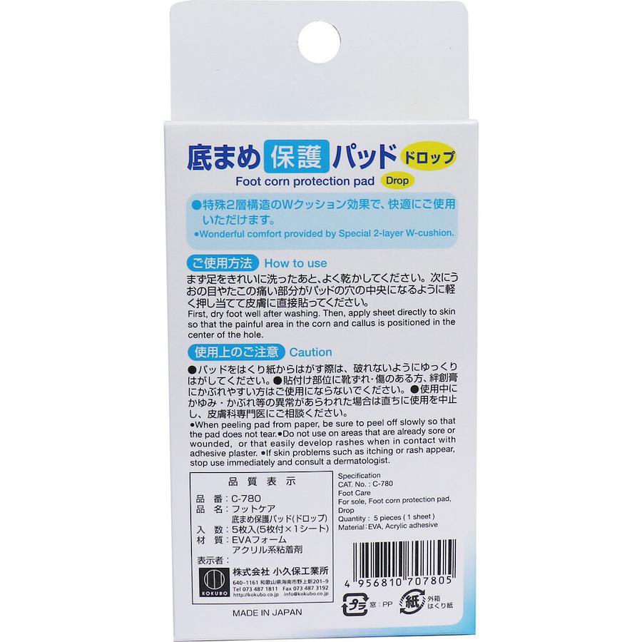 足の健康をサポートします!●目立ちにくい肌色。●低アレルギー性粘着剤を使用していますので、お肌が敏感な方にもお使いいただけます。※アレルギー症状が出る場合もありますのでご注意ください。●足裏用の底まめ保護パッド。●足裏のまめ、うおの目、たこなどが当たる部分に貼って保護します。●外径約3×3.8cmのドロップ型。中央に穴つき。●厚さ約3mmの特殊2層構造らくらく快適Wクッションで、当たりをやわらげます。●抗菌加工。●5枚入。●こんな方に。・足裏のまめ、うおの目、たこが気になる方に。・底まめを保護して、当たる痛みをやわらげたい方に。